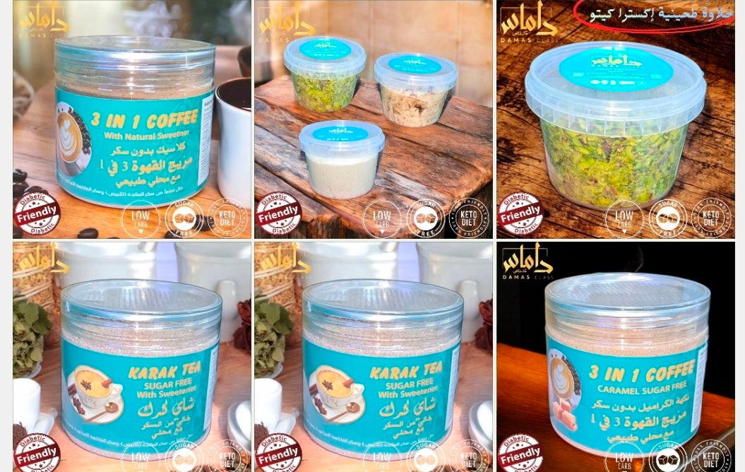 تشكيلة متنوعة من المنتجات الكيتو الجاهزة للاستخدام، تشمل المحليات، المشروبات، النسكافيه،...